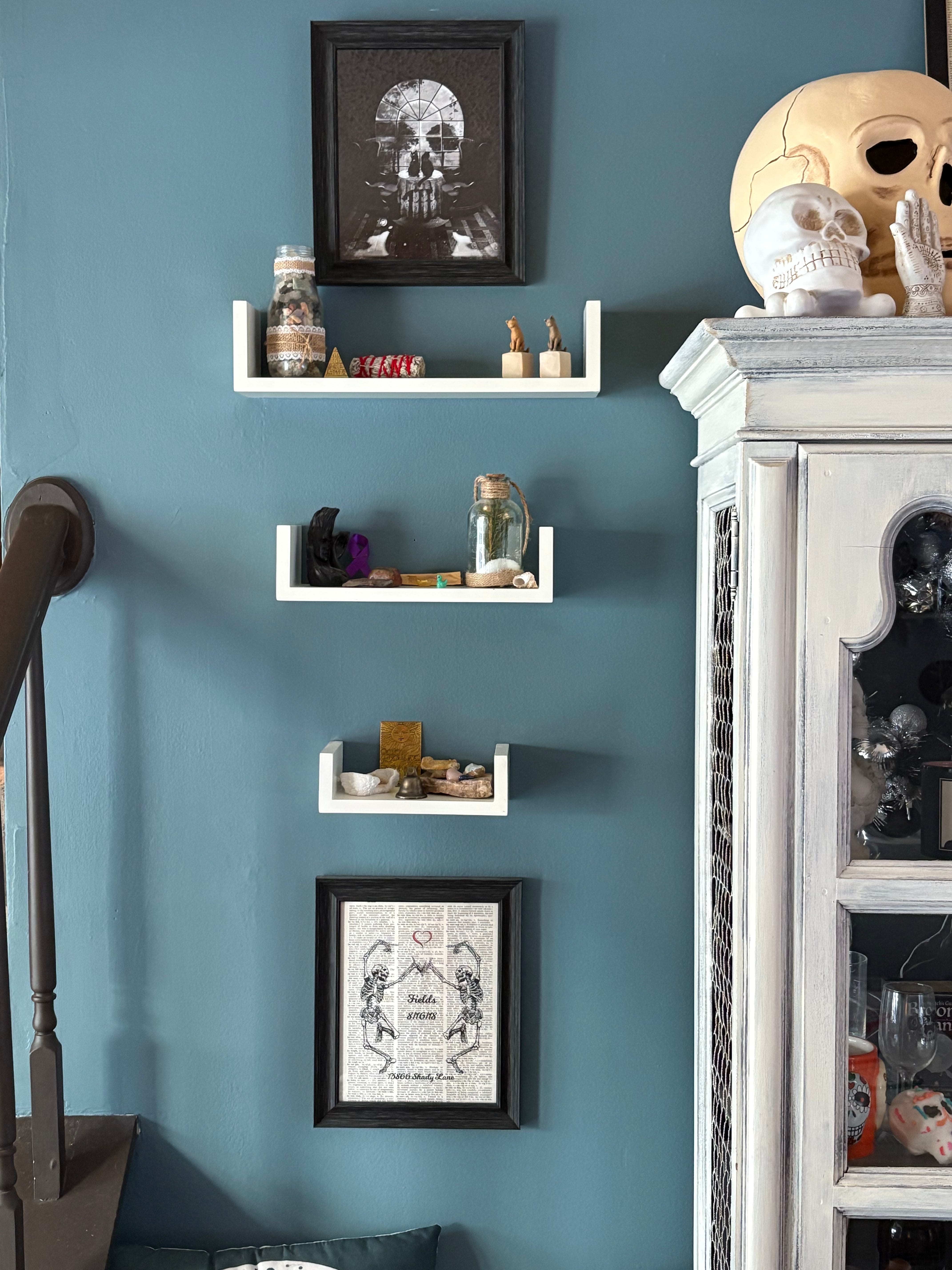 Upstairs, our family room is decorated in skulls. Yes, skulls. There are well over 100 tucked into that room - from candles to a hutch full of skull mugs and wine bottles, to warmers, to framed art.